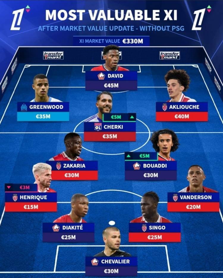 不含巴黎球员的法甲身价最高阵容↓
